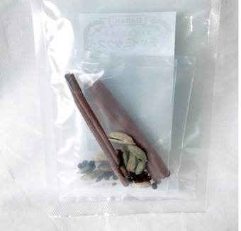 1袋にシナモン(1本)、カルダモン(5粒)、ブラックペッパー(6粒)、クローブス(3粒)が入っており、2袋入りにます。